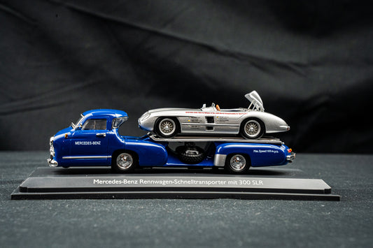 Mercedes Benz Transporter mit Mercedes Benz 300 SLR und Figur Alfred Neubauer - Schuco 1:43